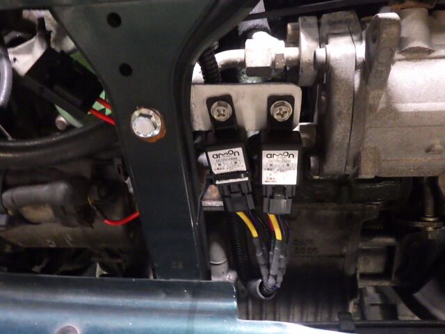 ヘッドライトの光量アップとスイッチを保護するためリレーを装着。