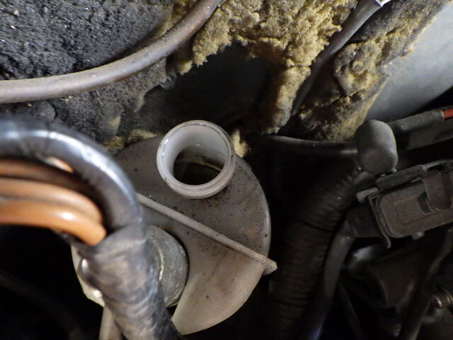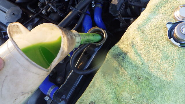 外してあるバイパスホースからエアが抜いて一気にクーラントを注入。。。