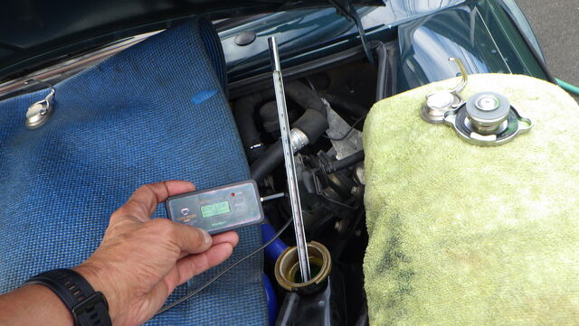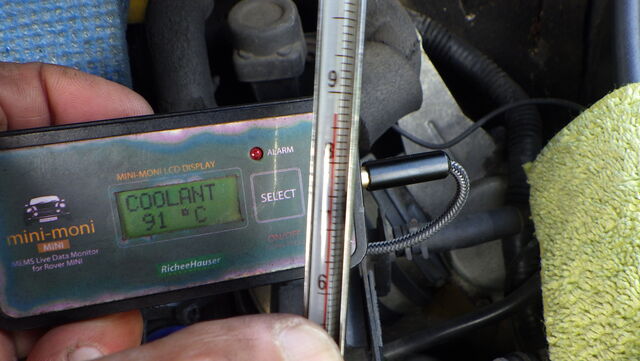 水温センサーの数値をミニモニで見ながらラジエターに挿した温度計と比較していきます。。。