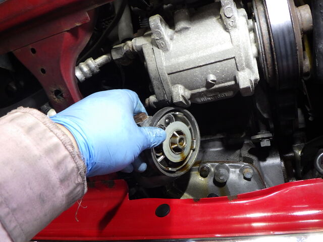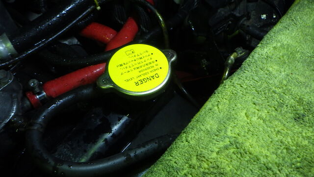次は電動ファンの作動確認ですが、100℃近くなってきたのでラジエターキャップを締めます