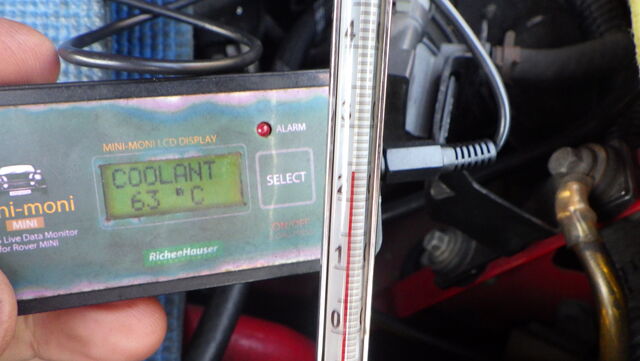 エンジン側の水温センサーは63℃まで上昇してますがラジエターに挿した温度計は24℃をキープ。