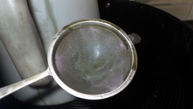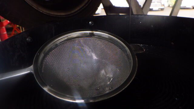 さて 70㎞走行したオイルを茶こしで濾して抜きます。。