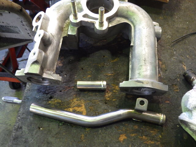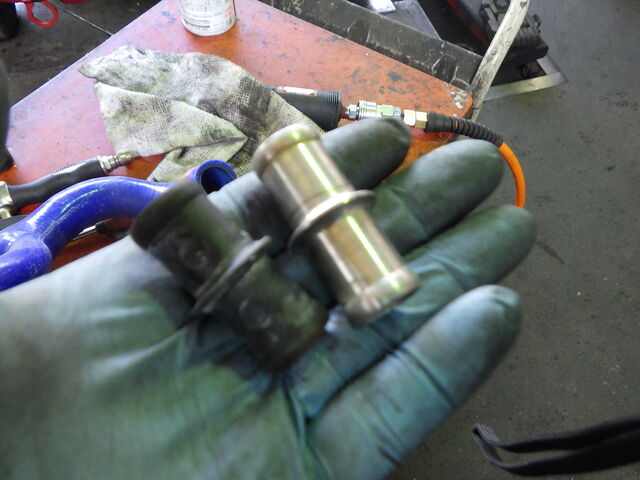 ヒータージョイントパイプは純正の樹脂のままでした。こちらはいきなり折れてクーラント漏れなどが発生しやすいのでステンレスヒータージョイントパイプに交換します。