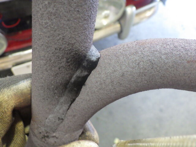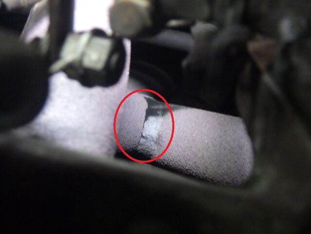 割れてしまったところから排気ガスが漏れて黒くなっていますね。