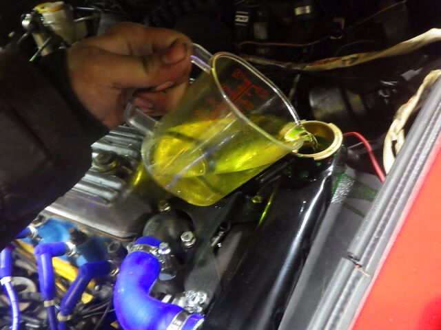 ラジエーターにLLCと水路保護のためのクーラントブースターを投入。