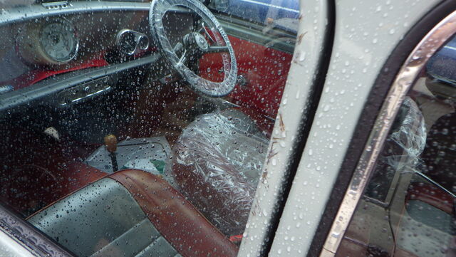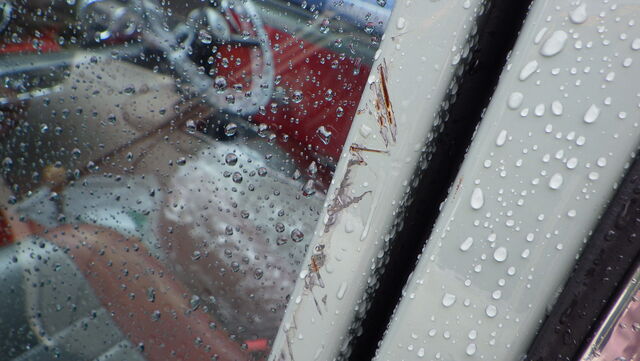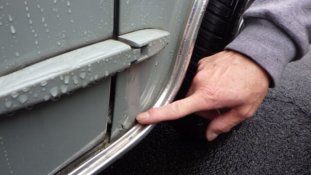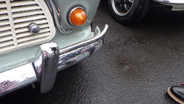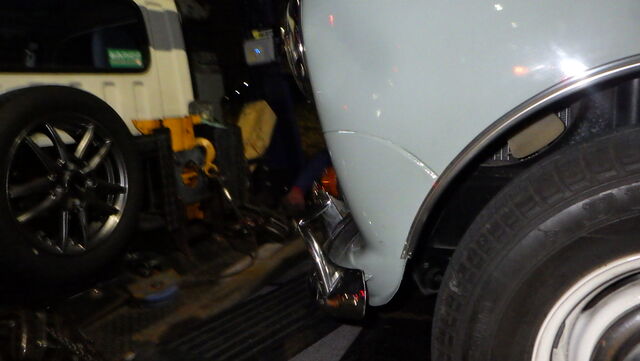 雨で傷が見えませんがバンパーは押されてから戻った感じ・・・