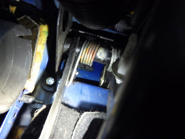 クラッチマスターの下が濡れています。クラッチオイルが漏れてしまっているようですね。こちらは次の車検のときに交換しましょう。