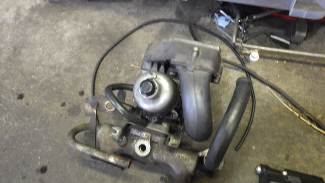 部品が出ない可能性があるので、極力ターボ廻りの部品を外さずにエンジンを傾けて