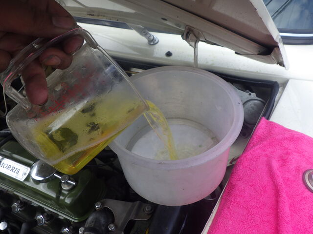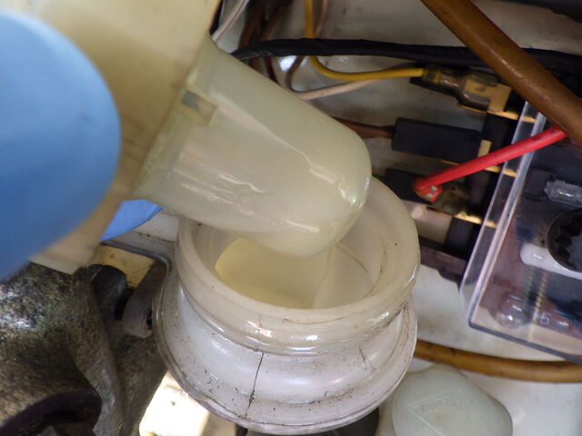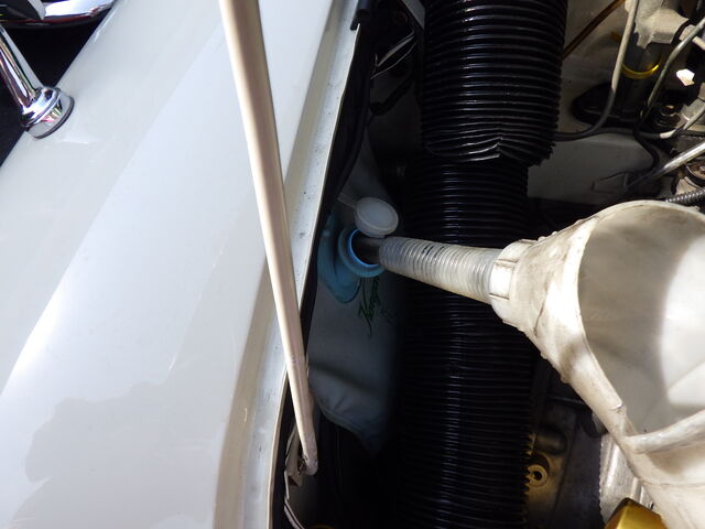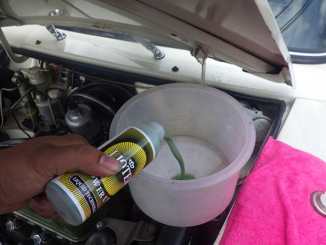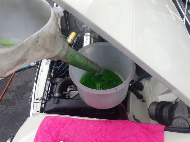 ラジエーター内のクーラントをすすぎだします。抜いたクーラントは綺麗でした。