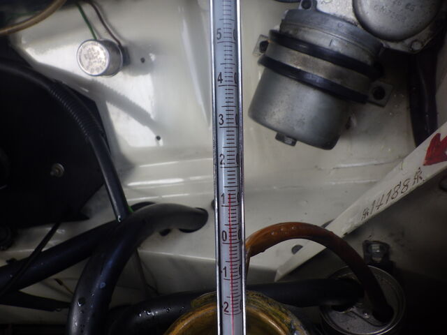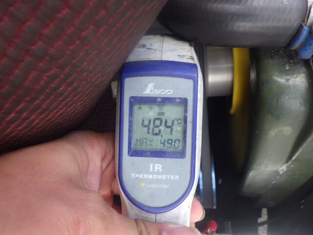 しばらくしてラジエーターに勢いよくクーラントが流れ込んで来ました。このときの温度は84℃でした。サーモスタッドの開きもよいですね。
