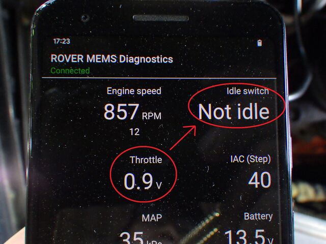 スロットル電圧が高くそれが影響しているのかノットアイドル表示。