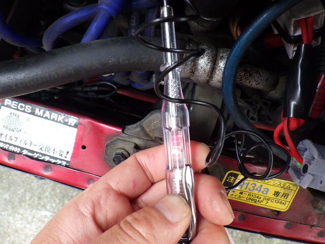 イグニッションコイルの⊖側にタコの信号が来ているのか探るため、タコ ドゥエル テスターを