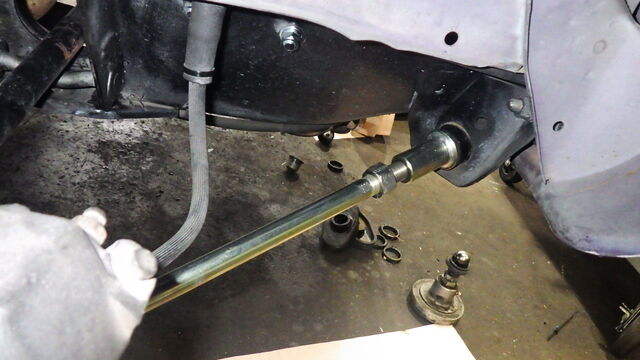 タイロッドエンド、上下ボールジョイント、ドライブシャフトの接続を外しスイベルハブを