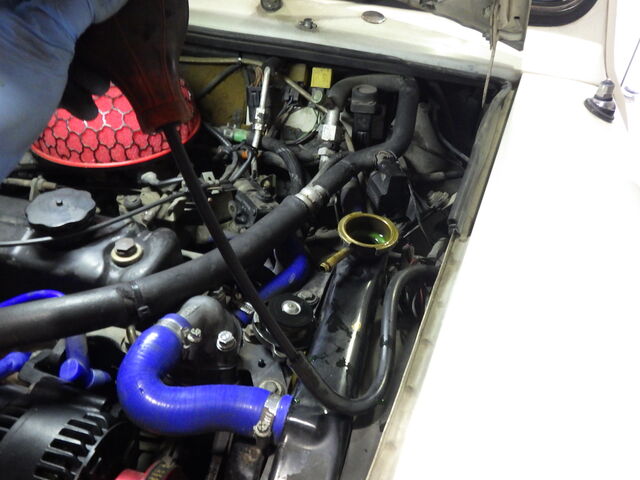 ブンとエンジンを吹かすと勢いよくラジエターに流れ込んでくるのが見えます。