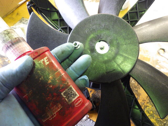 ナットが緩まない様にロックタイトを塗ってファンブレードの固定ナットを