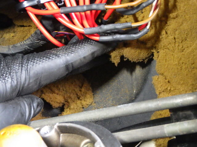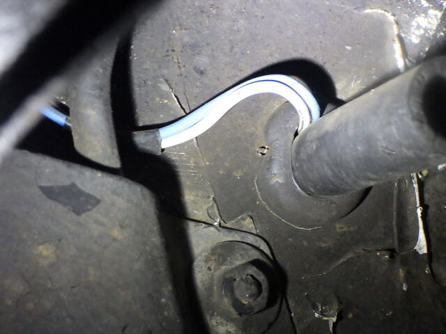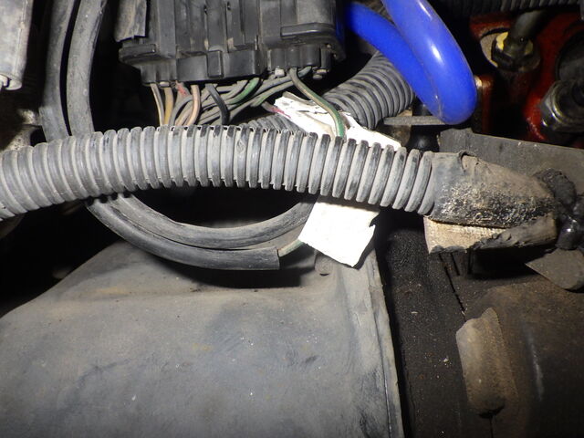 水温センサー側から配線を辿っていくと保護カバーが破れている所に