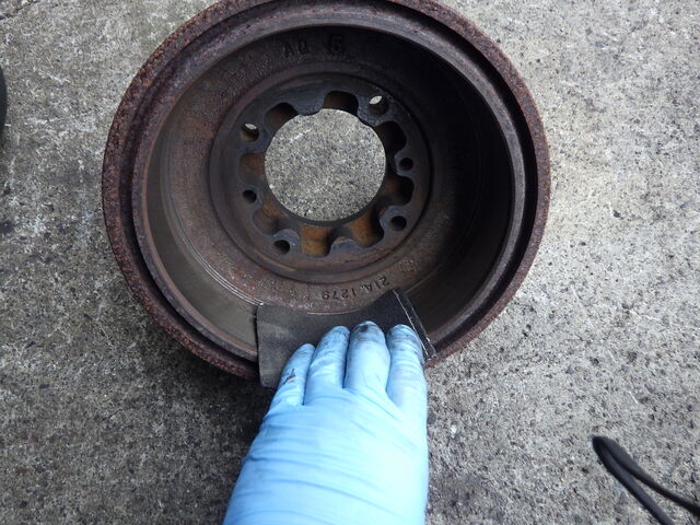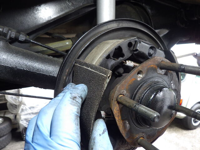 ブレーキシューは鳴き予防のため角を落として取り付けます。