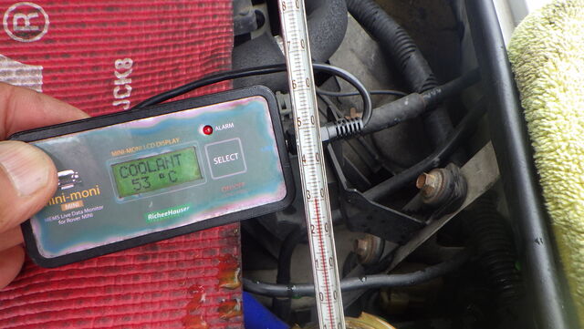エンジン側の水温センサー53℃、ラジエターに挿した温度計は30℃で十分な温度差があるのでサーモスタットの密閉は良好です