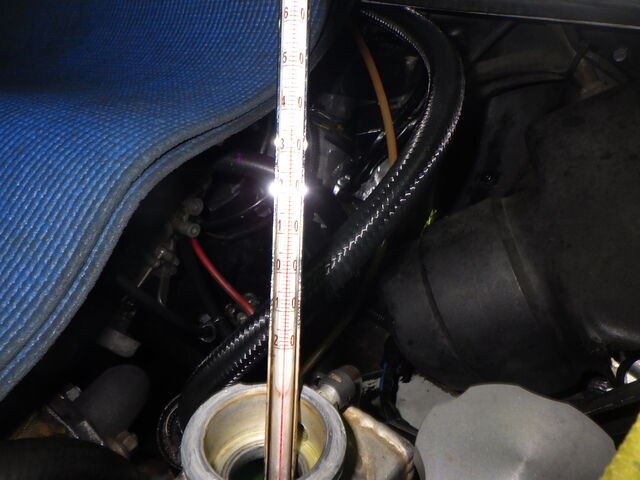 冷間時の水温を確認します。ラジエーター側20℃から測定、65℃で車内の水温計が